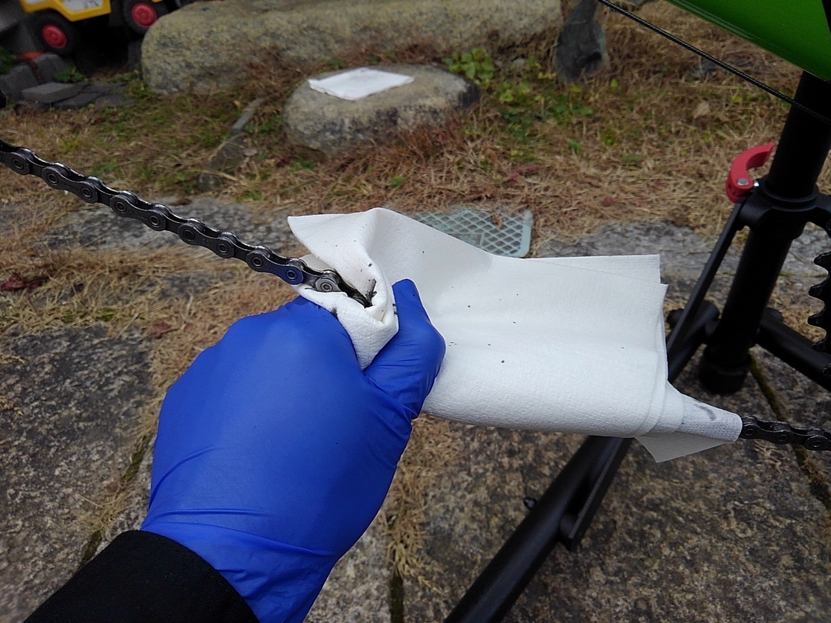 ふき取りは写真のように、チェーンをつかんでクランクをガンガン回します!