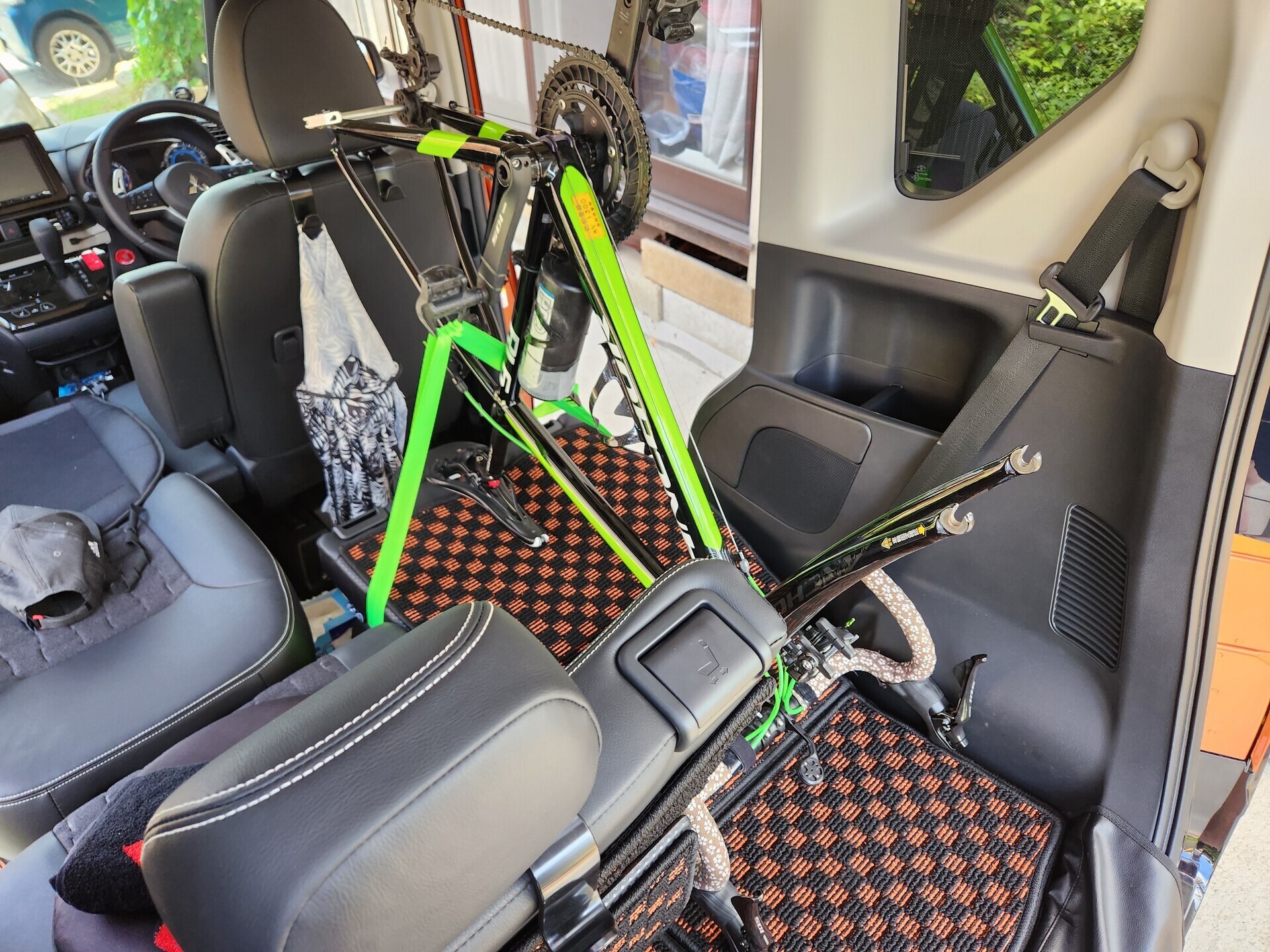 デリカミニでは、天井が高いのでサドルはそのままでも余裕で立てて載せられます。