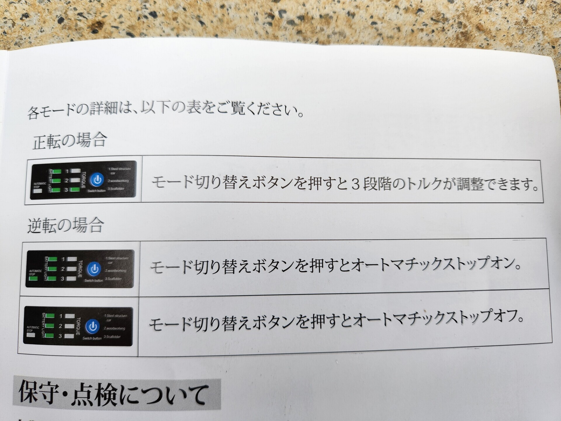 モードは正転(締める)と逆転(緩める)それぞれで設定できます。