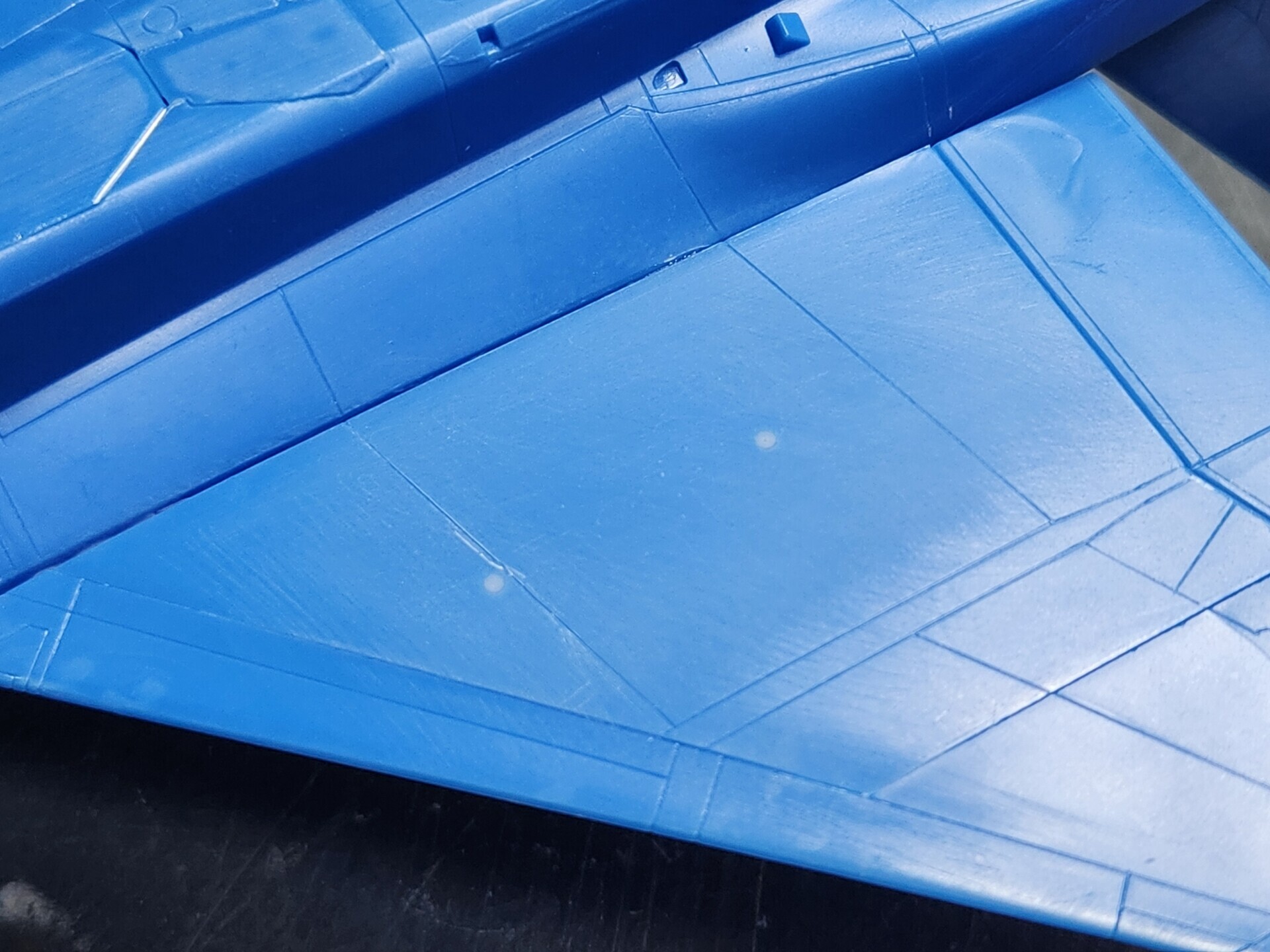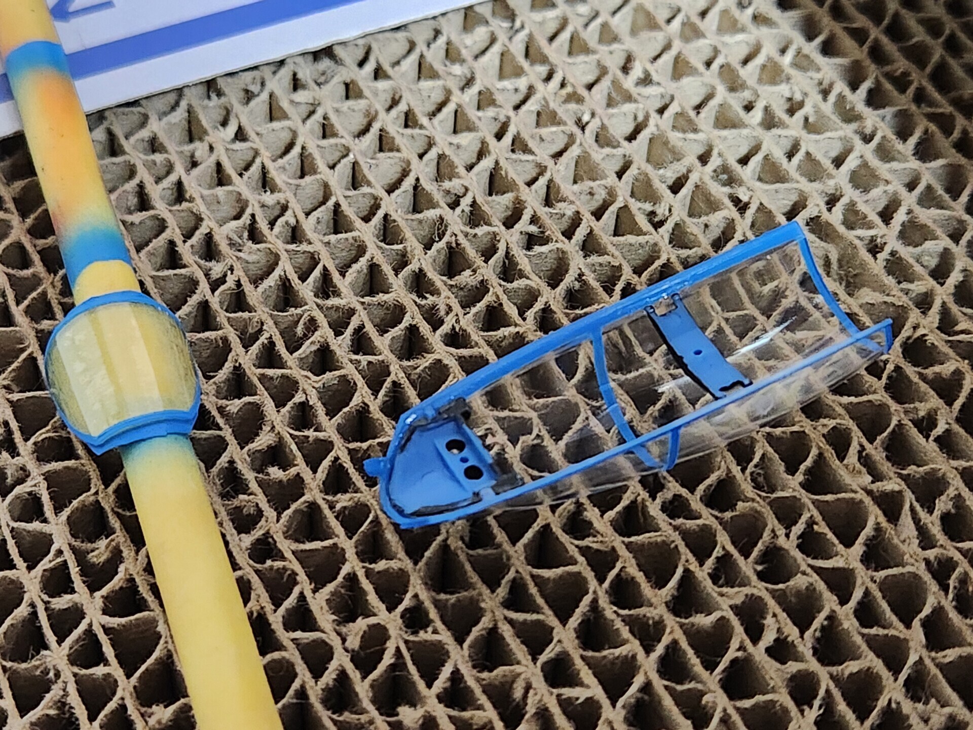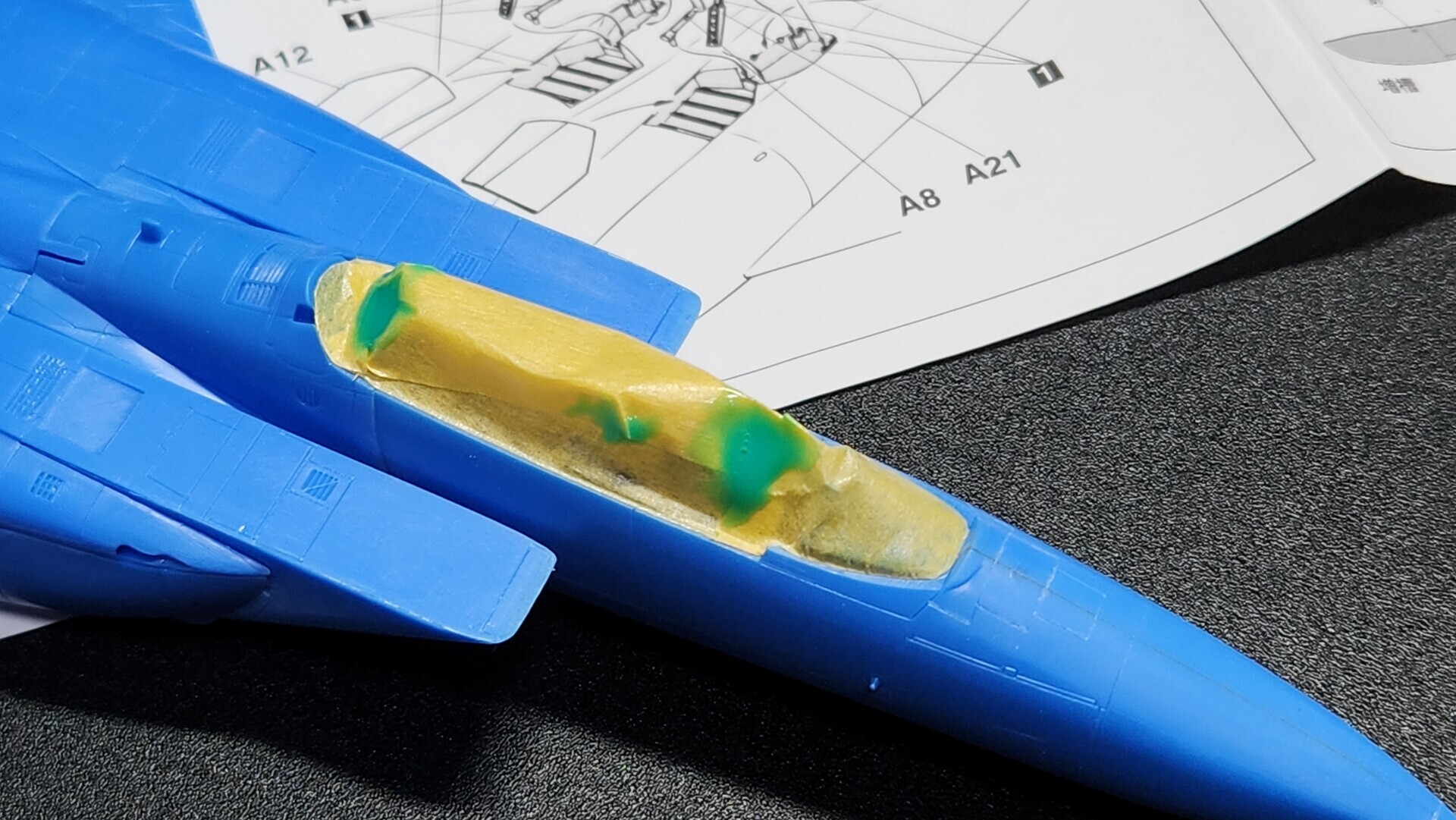 キャノピーの枠は通常の戦闘機プラモと違って、機体色の青で塗り分けします。