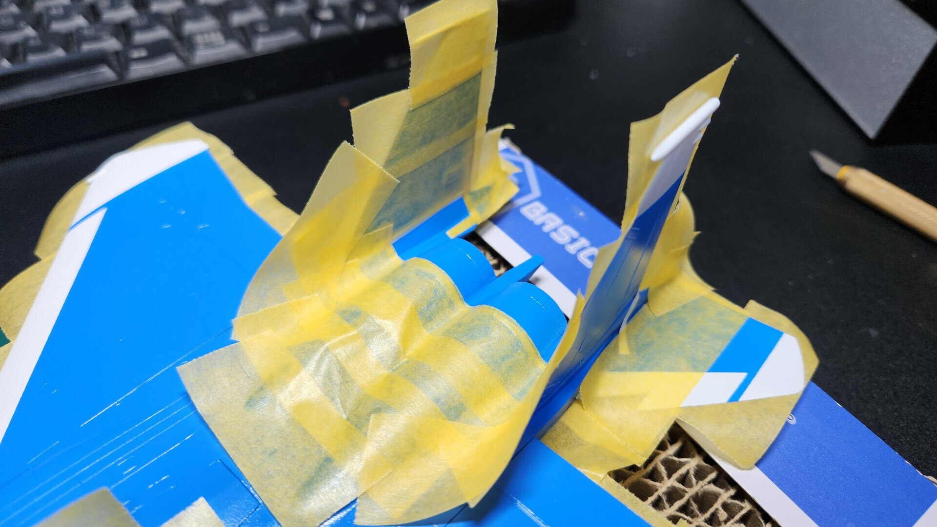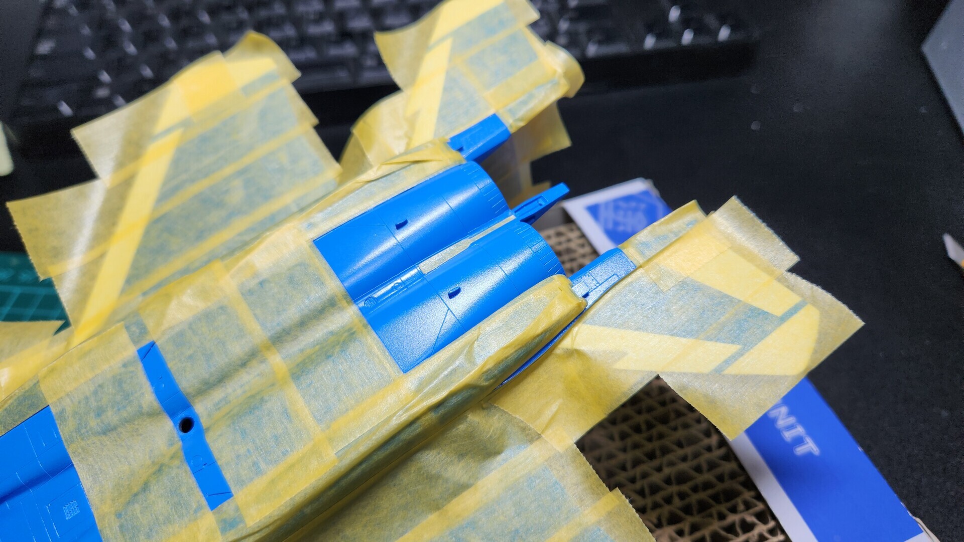 エンジン付近をシルバーに塗り分けるため、マスキングしました。
